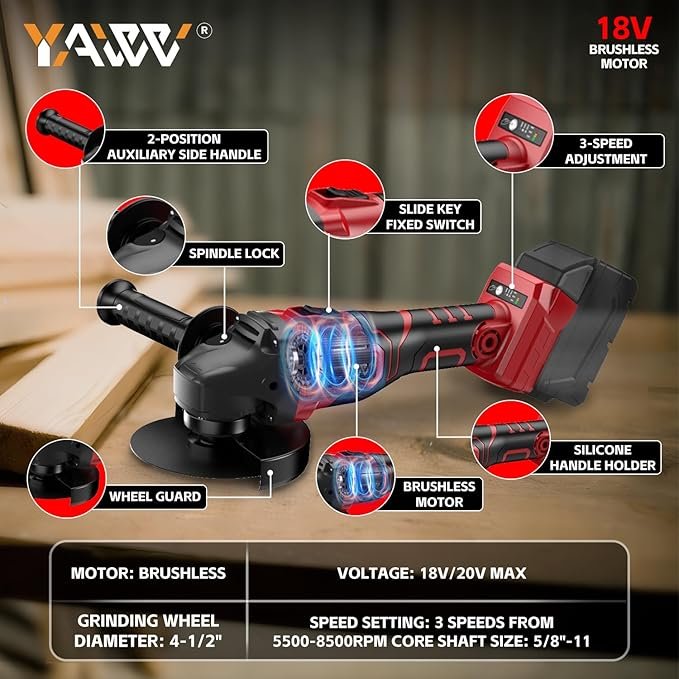 - 3 velocidades ajustables: la herramienta de amoladora angular inalámbrica está diseñada con 3 velocidades ajustables de 5500 a 8500 rpm/min. Ya sea que necesites moler metal, azulejos, hormigón, madera, piedra, proceso, bulding, industrial, molienda de cabina, decoración famyli, cualquier superficie pulida, esta herramienta de amoladora angular de potencia te tiene cubierto.