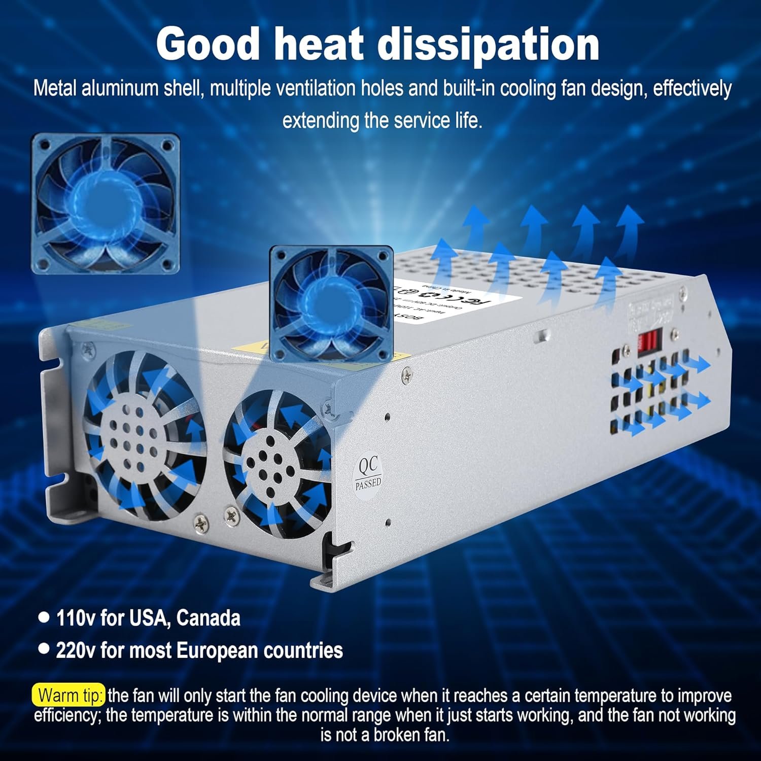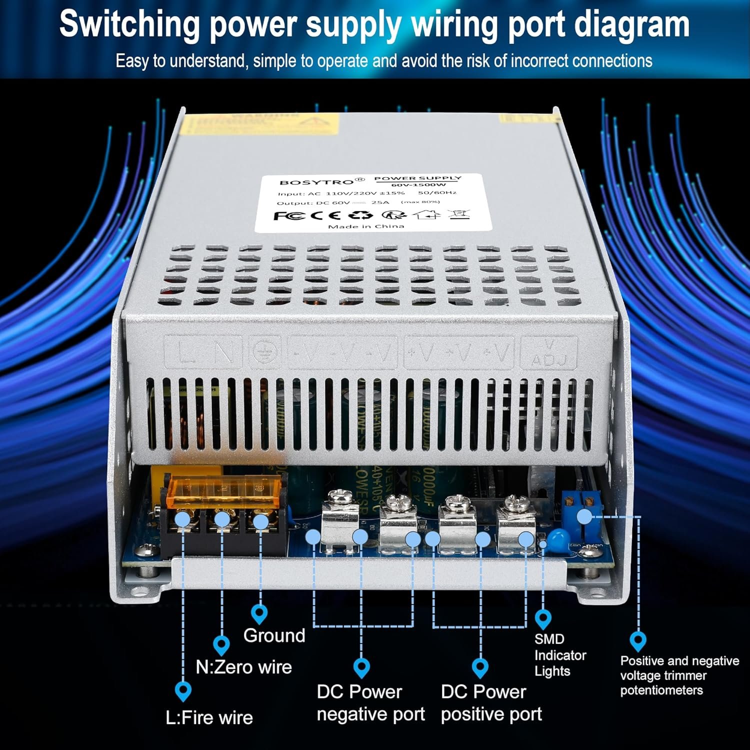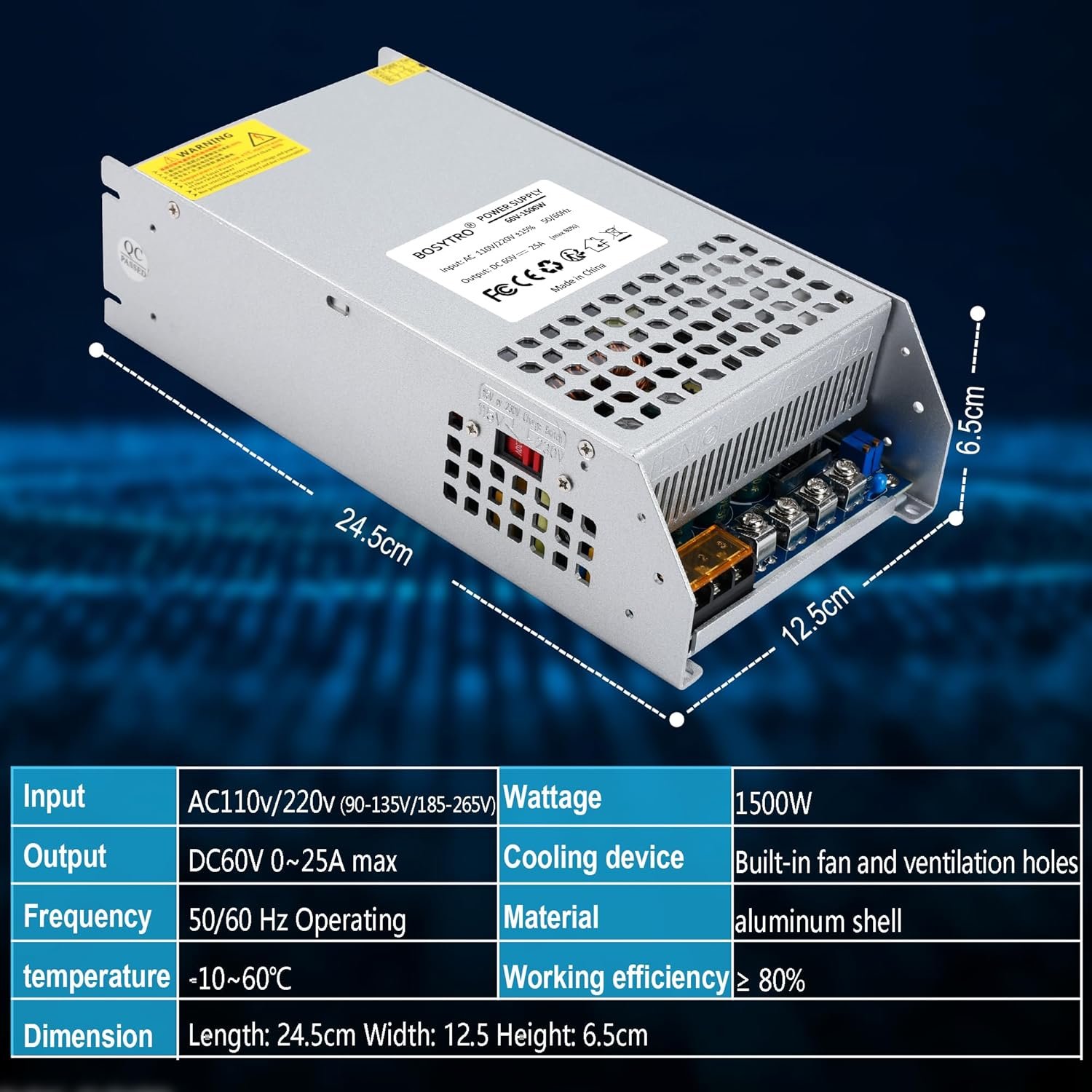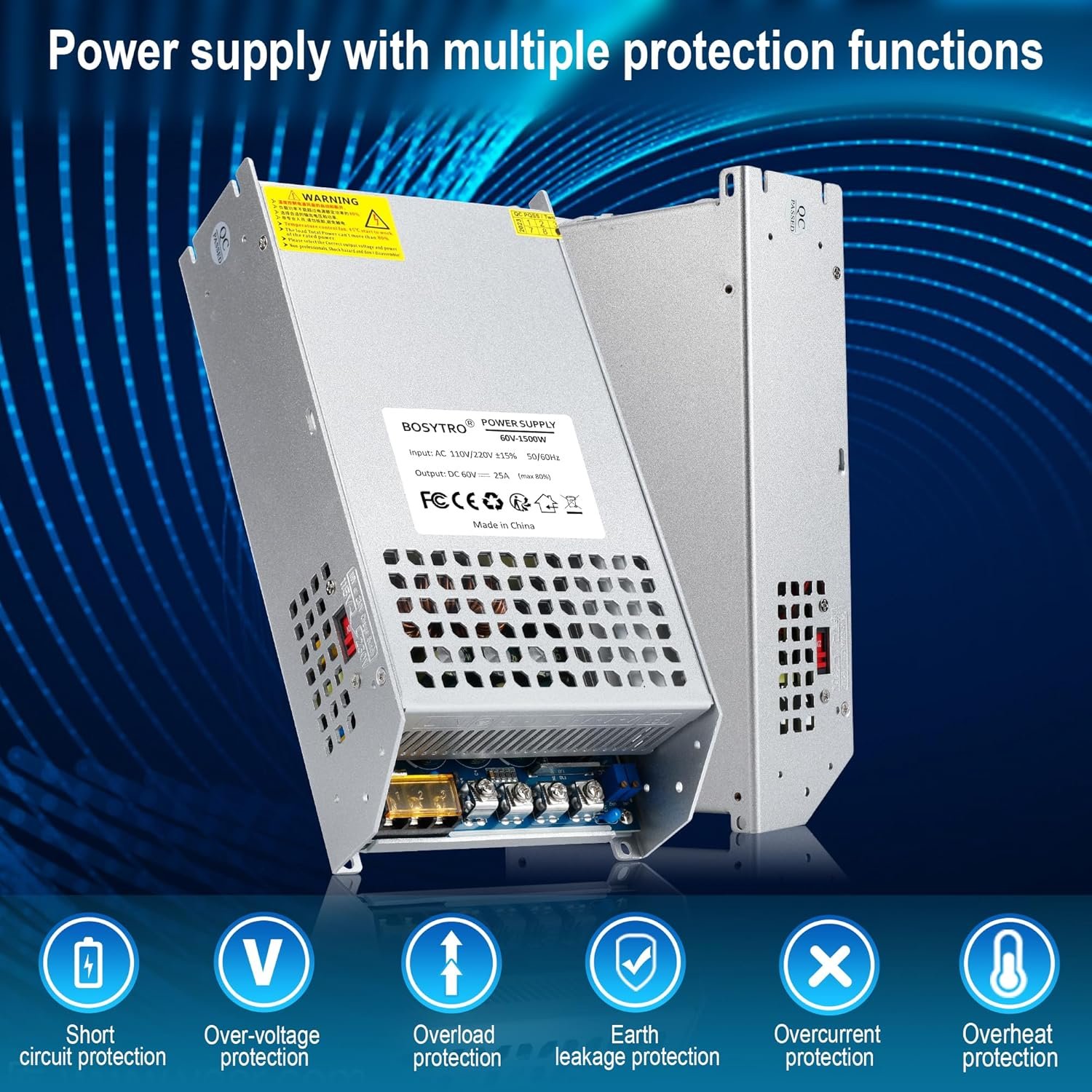 Aplicaciones: Recomendada para alimentar controladores de motores paso a paso, servomotores NEMA34 y tarjetas CNC que requieren 60V de corriente continua.